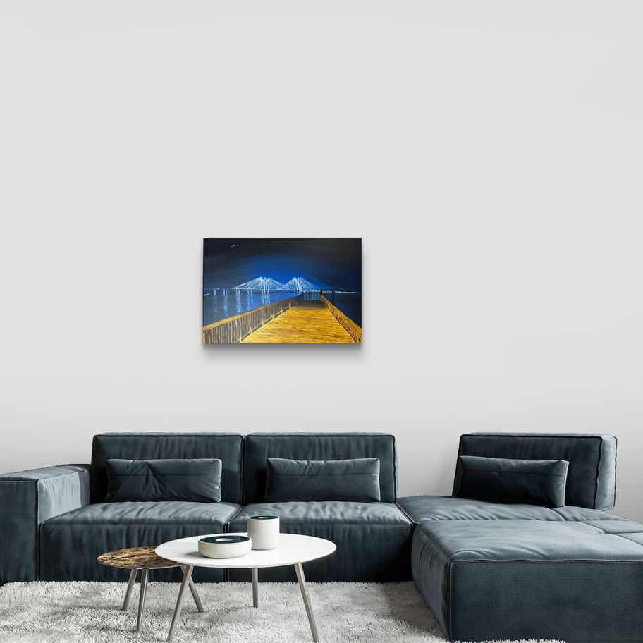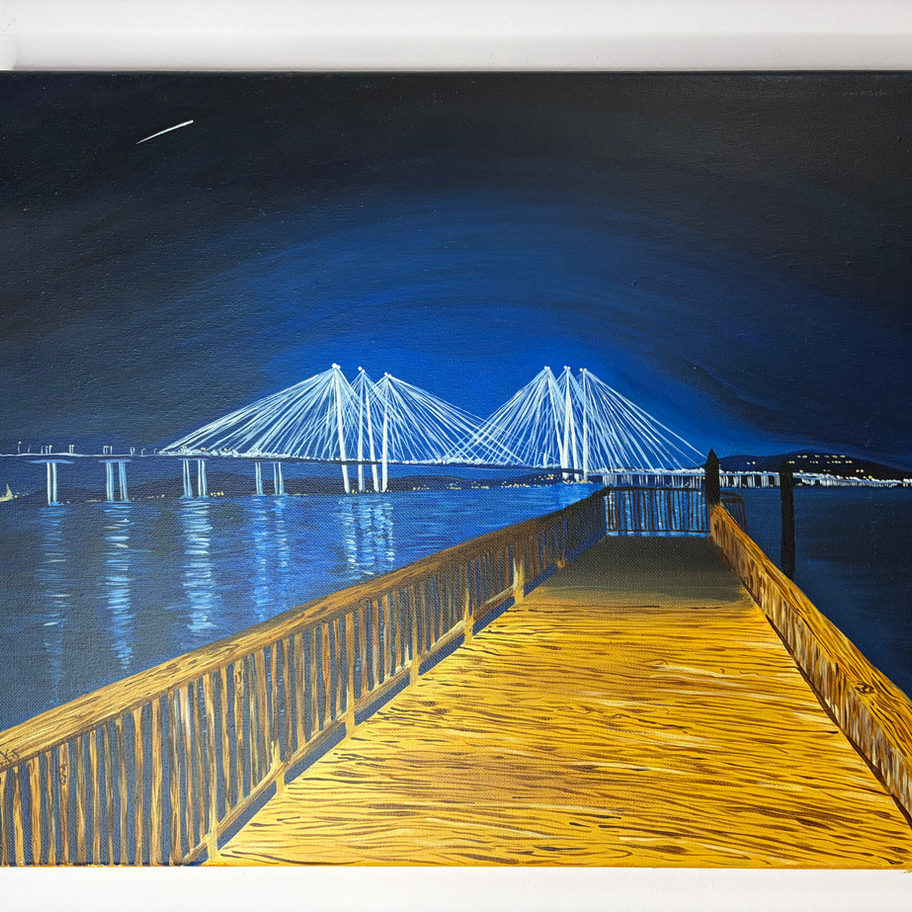 The Tappan Zee Bridge, otherwise known as the Governor Mario M. Cuomo Bridge, is one of my favorite bridges. Overlooking the water at night, I took a picture and painted what I saw. Perfect size for a bedroom or living room.